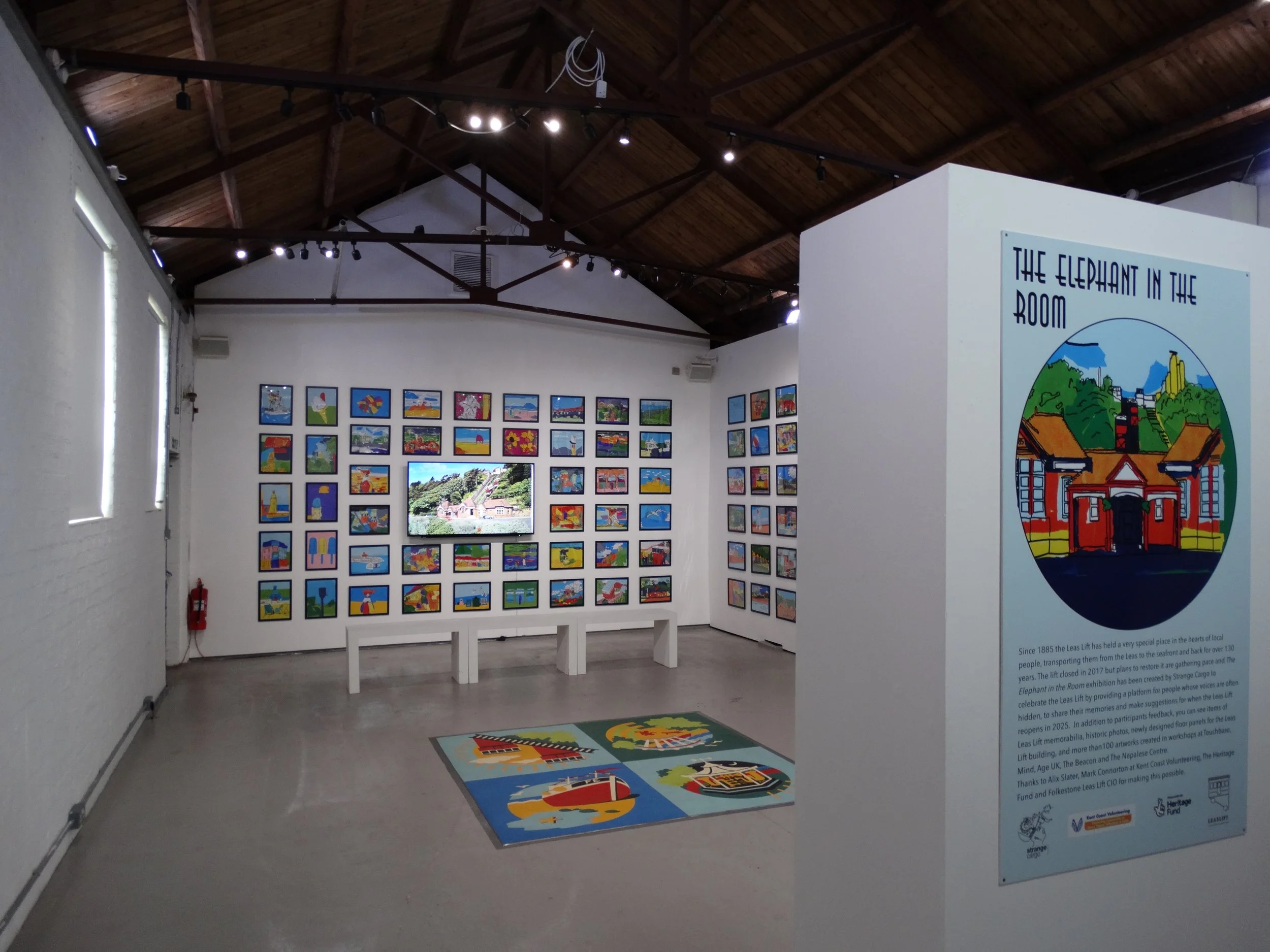 The Elephant in the Room exhibition took place at Strange Cargo’s Cheriton Gallery. Walls were filled with colourful, framed pictures of areas within walking distance of the Lift, a reminder of the places we will all find much easier to get to once the Lift is working again.